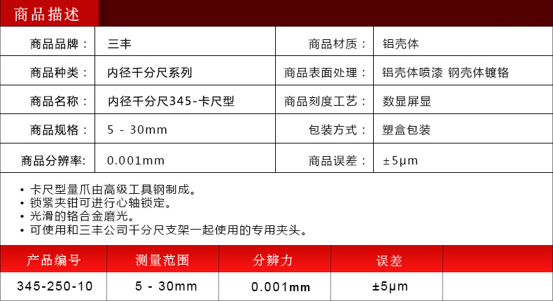 產(chǎn)品型號(hào):345-卡尺型數(shù)顯內(nèi)徑千分尺