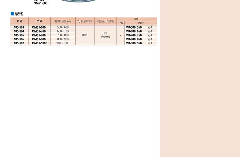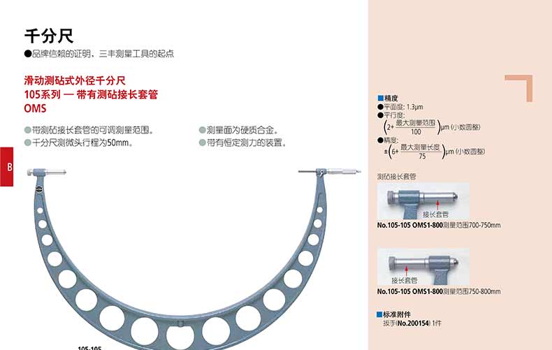產(chǎn)品名稱:日本三豐(mitutoyo)滑動測砧式外徑千分尺105 系列 帶有測砧接長套管OMS